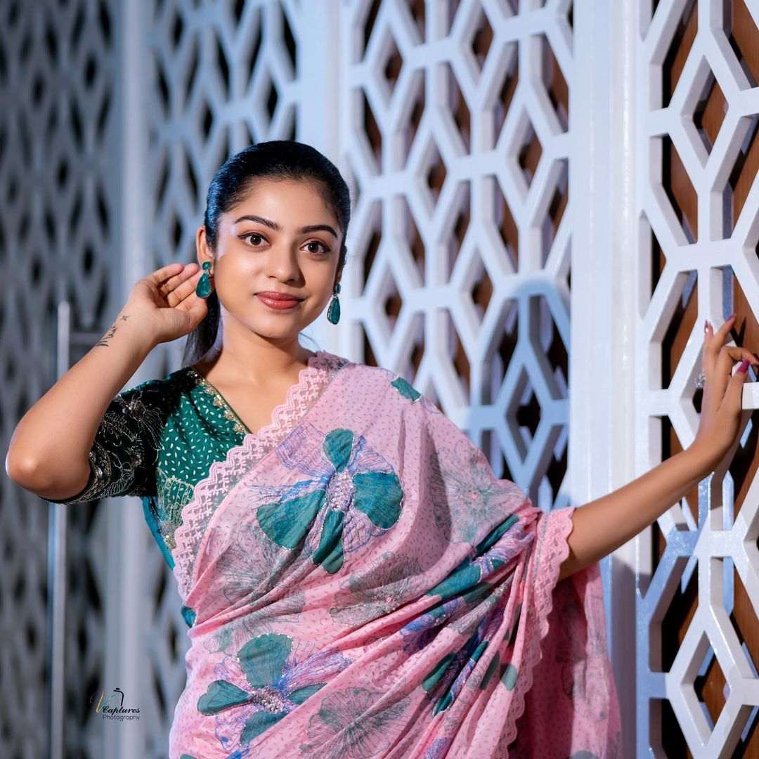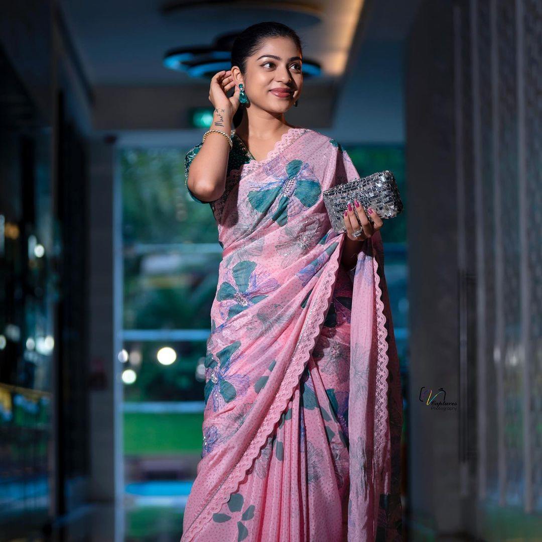 Actress Varsha Bollamma is on a roll. The beauty had us with her beautiful look in an ivory Anarkali and is here yet again to impress us with a saree look. This time she wore a peach saree from Issa Designer Studio and we love it. This is from their Roha Couture collections’22.