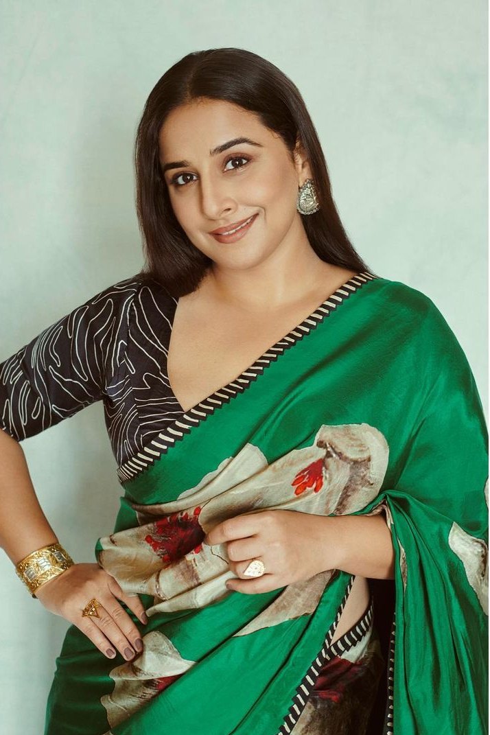 Vidya paired the saree with a set of oxidized silver earrings, a gold Kada and a set of rings from Kharikajai by Shivani Sharma. Contoured cheeks with dull eyemakeup, loose hair and nude lips completed the look.