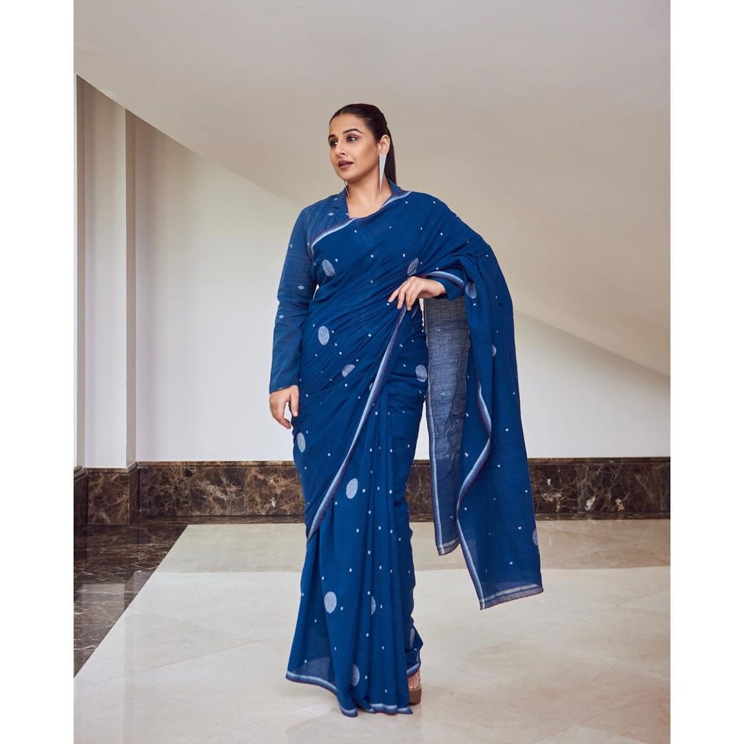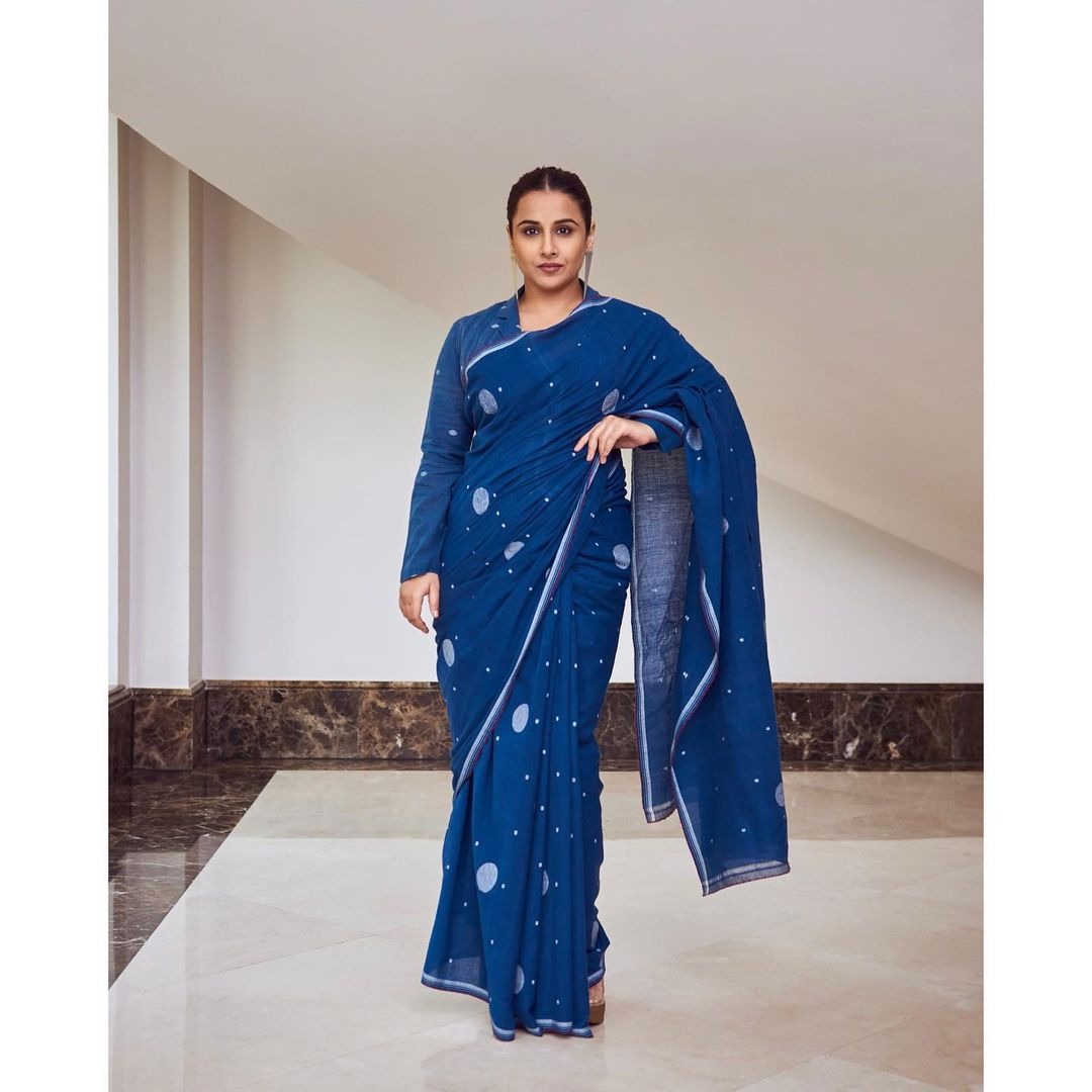 Actress Vidya Balan always treats her fans with some graceful saree looks whenever she is promoting a movie. A major chunk of those are often handloom sarees and have a natural beauty to them. In fact, her latest look has her wearing an indigo jamdani weave saree by Urvashi Kaur.